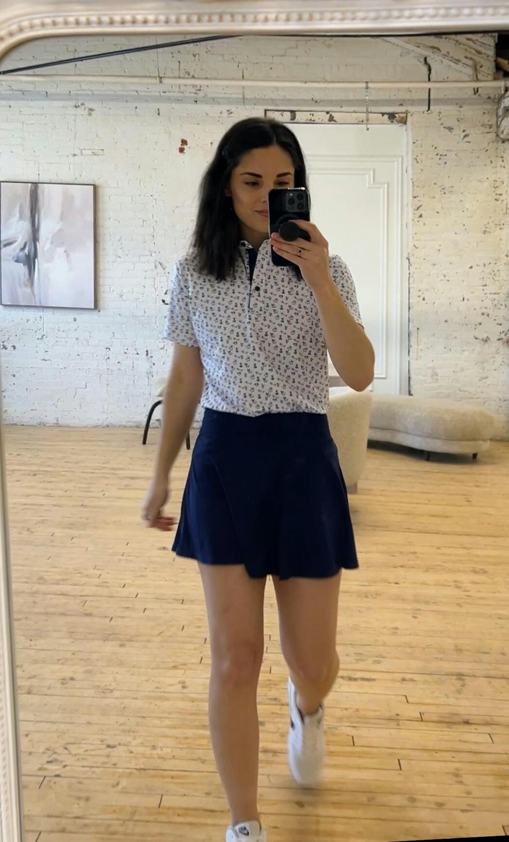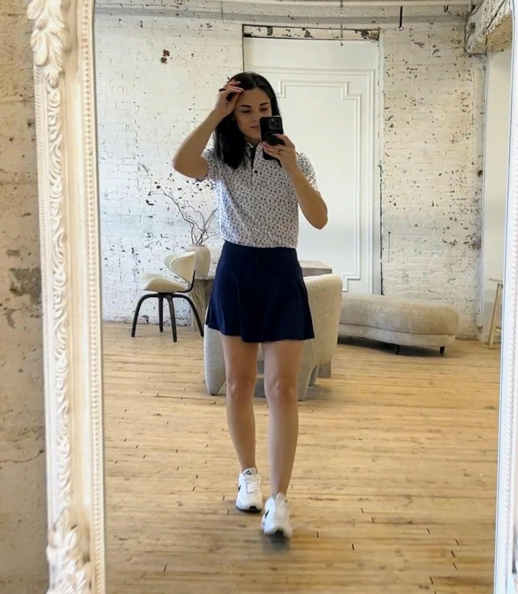 This flowy skirt is 15 inches in length and comes with built in shorts. The shorts have a pocket on the side for all of your golf needs! We are confident you will get an Ace in this adorable skirt this golf season!